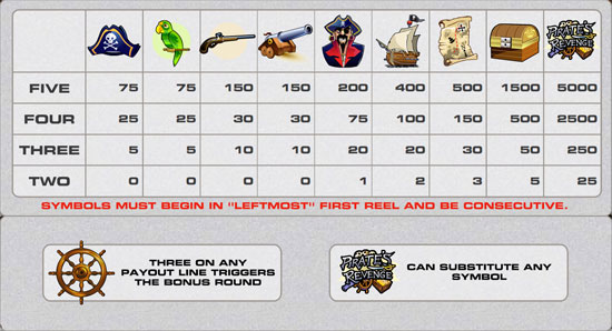 Pirate's Revenge is a five reel slot machine. Each time a spin is made, the three reels come to rest randomly with a selection of symbols showing in the game window. Certain combinations of symbols results in payoffs. Consult the payout chart for reference to the amounts paid.